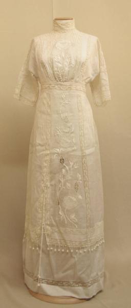 Abito intero lungo, a finta doppia tunica, in tela bianca leggerissima, con tramezzi in pizzo.\nCorpino con collo a guimpe steccato e maniche a chimono a tre quarti. Pettorina in crespo leggerissimo ricamato in bianco con inserti romboidali a reticello e tramezzi. Vita segnata da fascia con tramezzo orizzontale e nervature. Gonna diritta in quattro teli, ristretti in vita da nervature, intercalati da tramezzi. A destra falsa apertura verticale chiusa da cordoncino (lavorazione ad uncinetto) passante in asole ad ago. Il pannello anteriore centrale è ricamato come la pettorina.\nLa gonna giunge all'altezza del polpaccio ed è rifinita da tramezzi orizzontali e serie di nappine. Al di sotto è cucita una balza, che simula la doppia tunica, con pieghe a cannone sui fianchi, decorata da tramezzo orizzontale. Apertura posteriore, centrale nel corpino; la gonna ha apertura asimmetrica a sinistra con fitti minuti bottoncini.