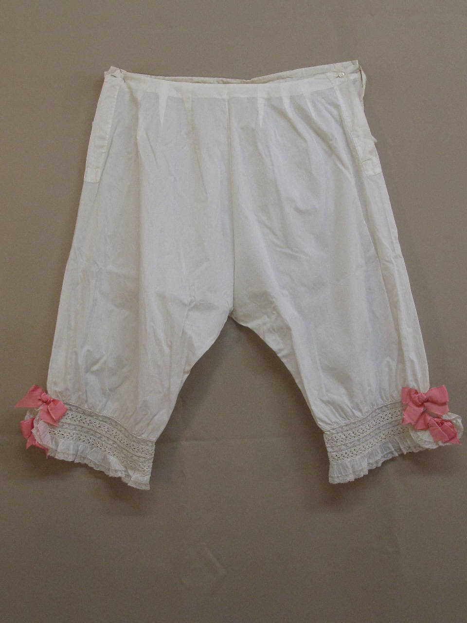 Ampie mutande lunghe al ginocchio in tela bianca con inserti e balze al fondo in merletto bianco. Aperte sui fianchi, chiusi da bottoni e coulisse sul dietro. Al fondo delle gambe due fiocchi in nastro rosa chiudono un breve spacco.\nDavanti a sinistra ricamate a punto cordoncino in cotone bianco le iniziali LDC.