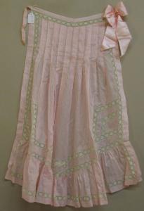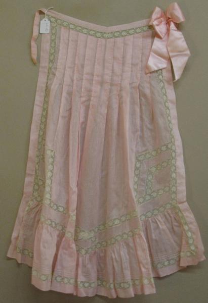 Grembiule lungo, da legare in vita, in tela leggera rosa con inserti in merletto avorio. L'ampiezza è raccolta in vita da pieghe simmetriche cucite nella parte alta.\nAll'orlo balza arricciata.