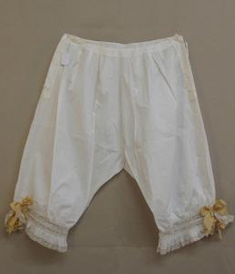 Ampie mutande lunghe al ginocchio in tela bianca con inserti e balze al fondo in merletto bianco. Aperte sui fianchi, chiusi da bottoni e coulisse sul dietro. Al fondo delle gambe due fiocchi in nastro giallo chiudono un breve spacco.\nDavanti a sinistra ricamate a punto cordoncino in cotone bianco le iniziali LDC.