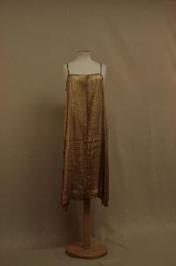 Abito a tunica lungo al polpaccio, in raso lamé oro e rosso. Scollo totale sorretto da spallini tubolari.\nDavanti e dietro ciascuno in un telo, con pieghe a cannone inserite nelle cuciture laterali, da sotto i fianchi all'orlo.