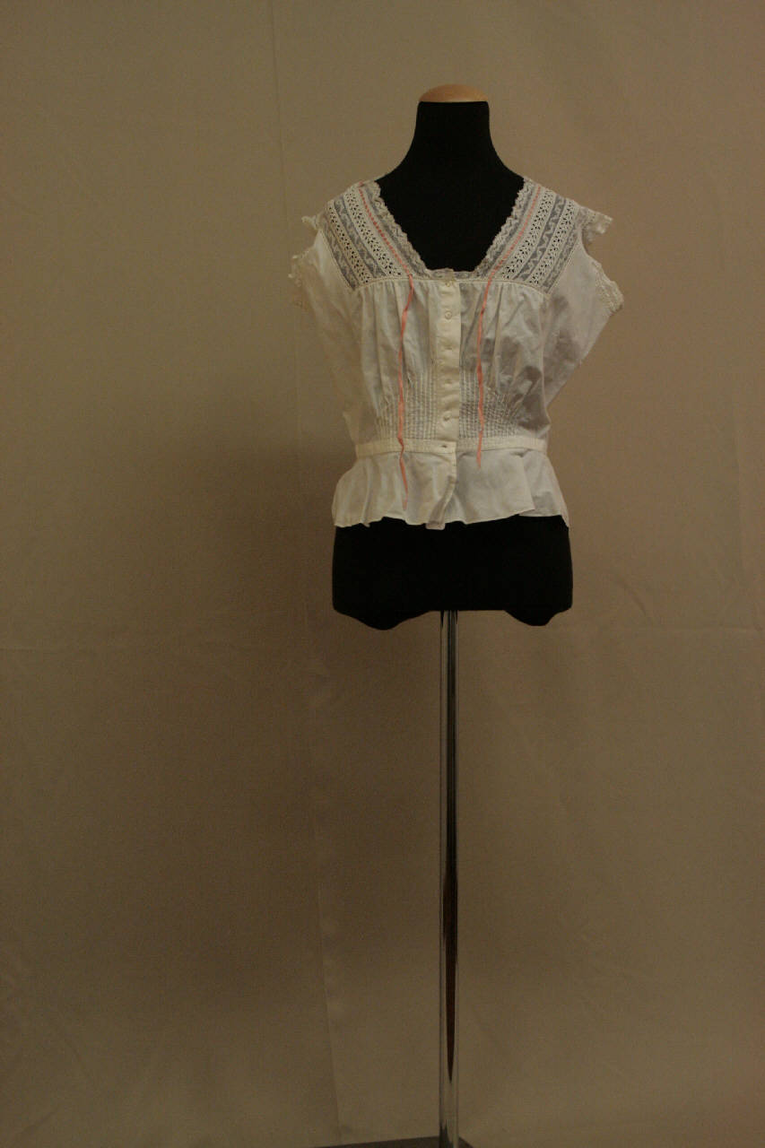 Copribusto di linea morbida in tela bianca. Davanti in due pezzi con apertura centrale chiusa da bottoni; di in un pezzo. Ristretto in vita da nervature e fermato da cinturino inserito che sostiene baschina in sbieco. Scollo a V, profondo sul davanti, sottolineato da alta banda in diversi merletti meccanici. Nastro in treccina rosa forma coulisse attorno allo scollo. \nGiromaniche profilati da merletto meccanico. \nPresso il fianco sinistro ricamate a punto cordoncino le iniziali LDC.