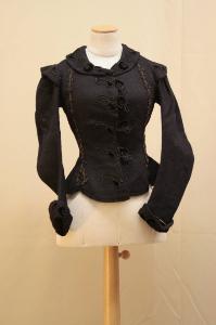 Giacca aderente, lunga poco oltre la vita, in tessuto nero (derivato da diagonale con effetti per diversa tensione dei fili). Scollo rotondo con collo semplice stondato; davanti modellato da pences, con piccole falde stondate. Apertura centrale chiusa da ganci.\nDietro in tre pezzi, sagomati al fondo con piccole falde stondate. Maniche decorate da alette, lunghe, sagomate, terminanti con piccoli paramani.\nCollo, alette, paramani e apertura decorati con elementi in soutache e velluto nero, realizzati a parte e applicati. Cuciture anteriori e dorsali coperte da sottile passamaneria nera e marrone.\nControfodera interna, fodera in raso nero; nelle maniche fodera in tela nera.