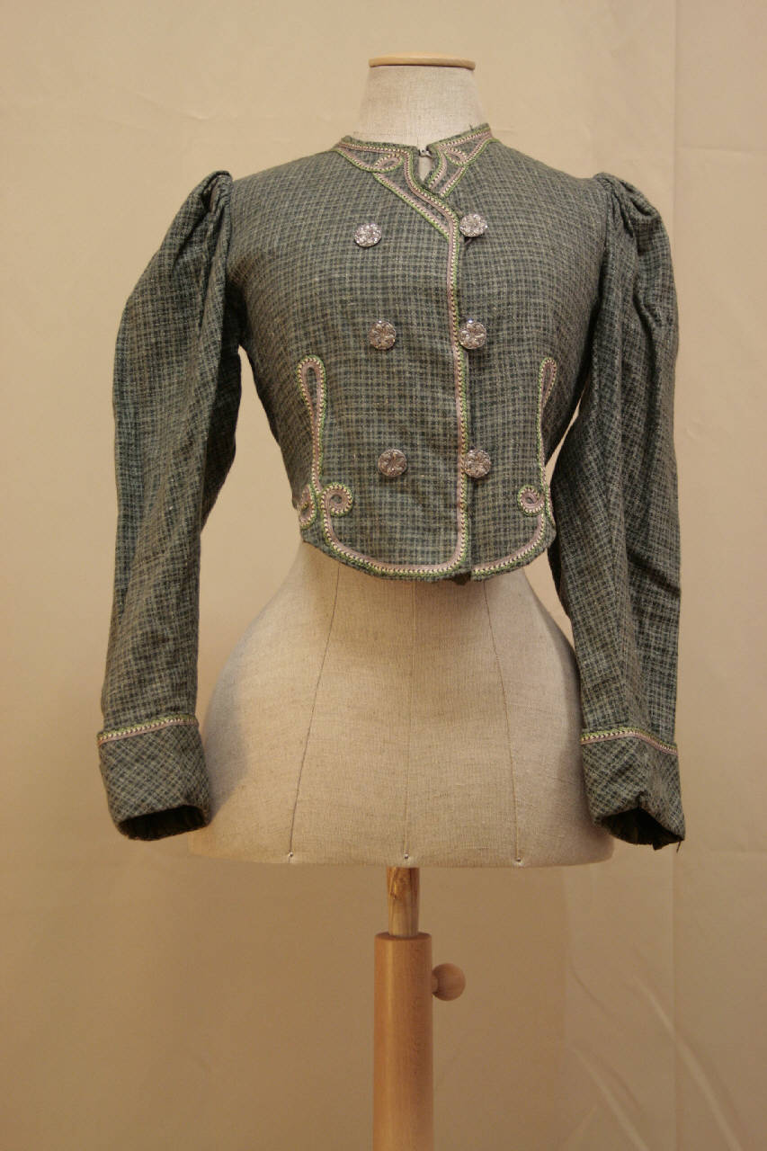Giacca aderente corta in vita, in diagonale quadrettata verde scuro e chiaro. Girocollo con bordi sagomati, apertura a doppiopetto chiusa da 8 bottoni in metallo disposti a coppie.\nDavanti modellato da pences, con punta stondata che scende oltre la vita; dietro in un pezzo. Maniche a prosciutto, lunghe, con alto paramani.\nLa giacca è profilata da spighetta in seta verde, bianco, nero e grigio che forma motivi ad alamaro al centro dietro, in corrispondenza delle pences anteriori e lungo lo scollo.\nDoppiata con leggera tela bianca. Residui della fodera originale in taffetà verde oliva.