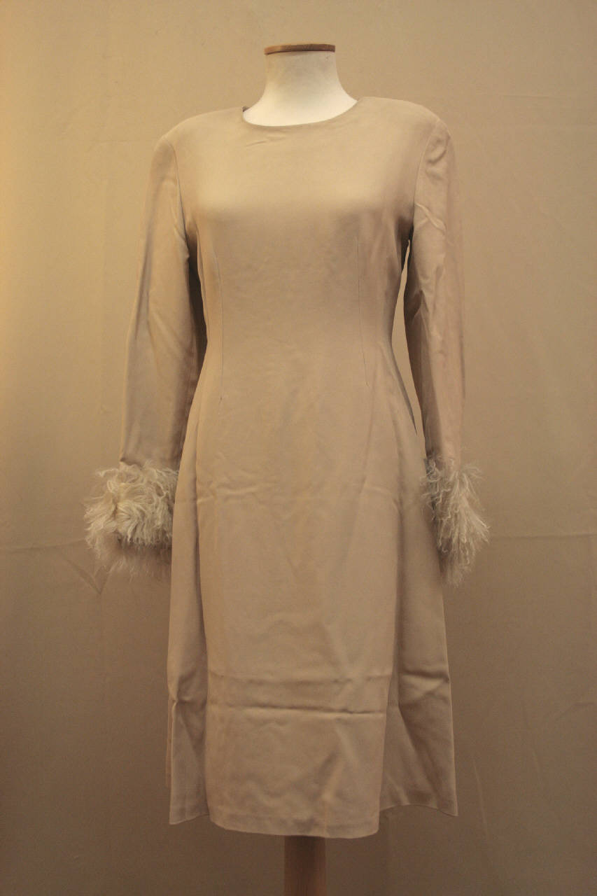 abito corto di linea diritta, in crespo avana. Modesto scollo rotondo, maniche lunghe diritte con applicazione di pelliccia in tinta al fondo. L'abito è modellato, davanti e dietro, da coppie di pinces; il dietro è in due pezzi con cerniera centrale. Fodera in taffetas avana.\nAll'interno, dietro, etichetta in nastro operato riportante "Raffaella Curiel".