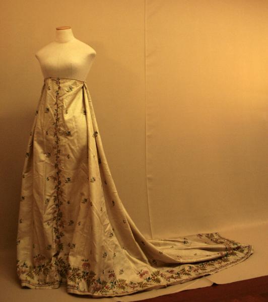 parti semiconfezionate di abito femminile di linea impero, gonna, corpino anteriore e telo: in taffetas a pelo strisciante avorio, ricamato a disposizione con piccoli boccioli di fiordalisi posti a scacchiera seminati sul fondo, ghirlandine di rose per profilare bordi, ghirlanda di rose, felci e bacche lungo l'orlo e al centro davanti.\nGonna in 4 teli e 2 piccoli gheroni; le cuciture tra i teli anteriori e quelli posteriori sono eseguite a punto indietro prima del ricamo, mentre l'unione tra davanti e dietro è a filza e sopraggitto con grossolani punti in filo di cotone. Corpino anteriore a vita alta, con orlatura lungo lo scollo e filza irregolare lungo il margine inferiore. Il telo ha un'ampia zona libera dal ricamo, ricamo a disposizione per bordure con serie di ghirlandine di rose, per tagliare maniche, dorso, fianchette e spallini.