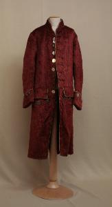 Marsina in felpa rosso scuro, con pelo lungo e fitto al diritto, più rado ma lungo al rovescio; profili in nastro di seta ocra.\nCollo a cinturino (h 5 cm), mostre diritte, 9 bottoni in acciaio dallo scollo a sotto la vita e occhielli funzionali corrispondenti. Tracce di una diversa precedente soluzione per l'allacciatura.\nTasche sui fianchi con patta rettangolare e 4 bottoni decorativi.\nManiche lunghe, con paramani con 4 bottoni decorativi.\nDorso molto ampio che scende sotto il punto vita; falde posteriori appena svasate, con finte pieghe laterali, decorate da bottone in alto; spacco centrale sovrapposto.\nFodera in tela rossa nelle mostre e all'altezza delle tasche; in tela bianca nelle maniche.\nLe cuciture, all'interno, sono coperte da fettuccia.