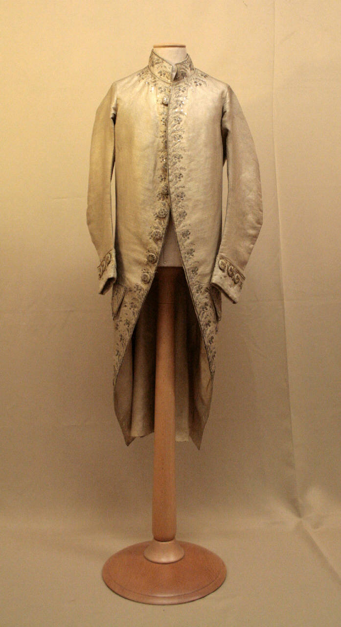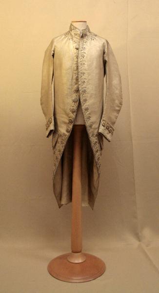 Marsina in taffetas lanciato in oro, ricamato in argento filato, paillettes e strass.\nCollo basso a cinturino (h 3,5 cm), mostre stondate con 9 bottoni rivestiti e nessun occhiello.\nFalde appena sfuggenti verso il dietro. Tasche sotto i fianchi con patta sagomata e 3 bottoni decorativi nel sottotasca.\nManiche lunghe, aderenti, sagomate con paramani in tessuto analogo ma lanciato in argento e ricamato in oro e 3 bottoni decorativi.\nDorso ampio che scende sotto il punto vita; spacchi laterali cuciti a tratti entro doppia piega decorati da bottoni in alto e all'orlo; spacco centrale.\nFodera in diagonale avorio.