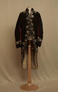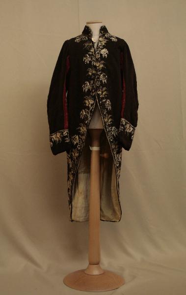 Marsina in panno marrone, ricamato in seta a punto piatto, erba e nodo, con motivi di fiori e grappoli di bacche in bianco e giallo, con dettgali in rosa.\nCollo a cinturino (h 5 cm), mostre stondate con 7 bottoni rivestiti (di cui 2 mancanti) e 1 occhiello funzionale. sul petto (probabilmente posteriore).\nFalde appena sfuggenti verso il dietro. Tasche sui fianchi con patta sagomata e 3 bottoni decorativi nel sottotasca (dei quali 2 perduti in ciascuna tasca).\nManiche molto lunghe, sagomate con alto paramani ora privo di bottoni.\nDorso ampio che scende appena sotto il punto vita; spacchi laterali cuciti entro piega decorate da bottone in alto; spacco centrale sovrapposto.\nFodera originale in raso avorio, con dorso e maniche in tela cardata avorio; numerose integrazioni in diversi tipi di tela e in jersey di seta sul collo.\nImbottitura nella parte anteriore delle spalle.\nLa marsina è stata allargata anche con inserimento di velluto rosso nelle maniche.