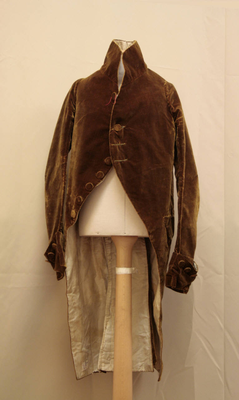 Marsina in velluto taglito unito color marrone chiaro.\nAlto collo a cinturino (h 9,5 cm), mostre molto stondate fino al petto poi nettamente sfuggenti verso il fianco, con 9 bottoni rivestiti e 3 occhielli funzionali sul petto.\nFalde molto sfuggenti. Tasche sotto il punto vita con patta sagomata e 3 bottoni decorativi nel sottopatta.\nManiche molto lunghe, leggermente arricciate il alto, aderenti, sagomate con alto paramani con 3 bottoni decorativi fermati a gemello con anello sul retro.\nDorso ampio che scende fino al punto vita; spacchi laterali aperti entro doppia piega decorati da bottoni in alto; spacco centrale.\nFodera in diagonale avorio, con tasca all'interno della mostra destra.