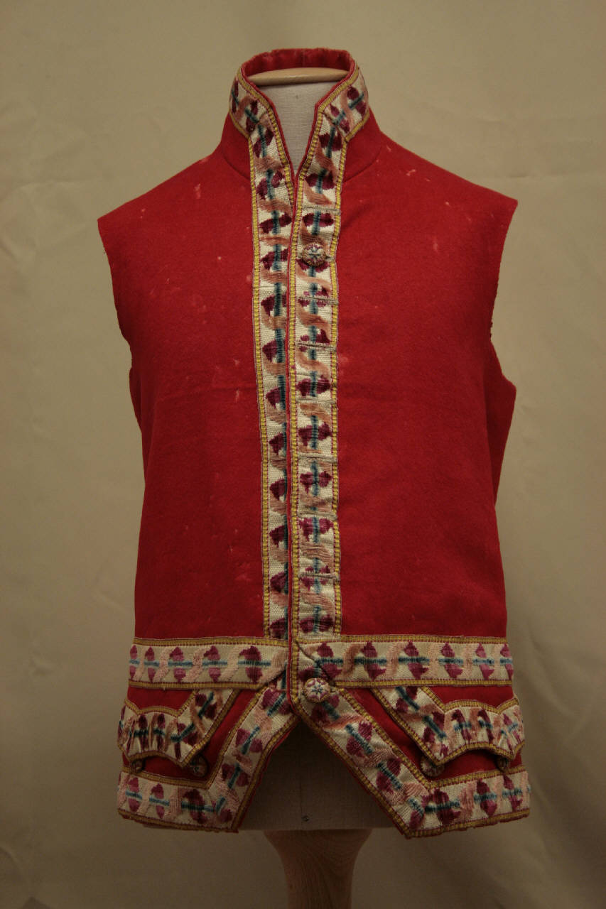 Gilè in panno rosso, lungo ai fianchi, decorato con alto gallone in velluto con motivo di nastro rosa-rosso a meandro. Alto collo a cinturino, mostre diritte chiuse da 10 bottoni ricamati e occhielli corrispondenti dallo scollo alla vita; falde divergenti a punta , con patte decorative sagomate; 3 bottoni sotto la patta. Dorso in tela nocciola.\nAll'interno del collo è ricamata la lettera "F".