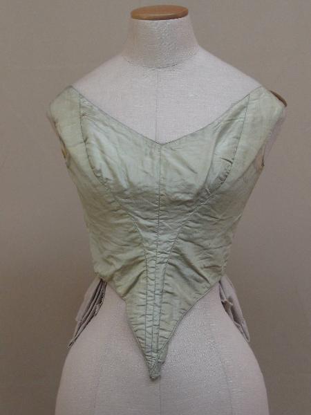 Corpino senza maniche, aderente, con stecche, in gros verde acqua, corto alla vita. Scollo ovale molto ampio. Davanti in 4 pezzi, con lunga punta centrale che scende oltre la vita. \nDorso in 2 pezzi, con fianchette; apertura centrale chiusa da laccio passante in 12 coppie di occhielli tondi; due stecche ai lati dell'apertura.\nScollo, giromaniche e orlo profilati da nervature.\nDoppiato in tela bianca.