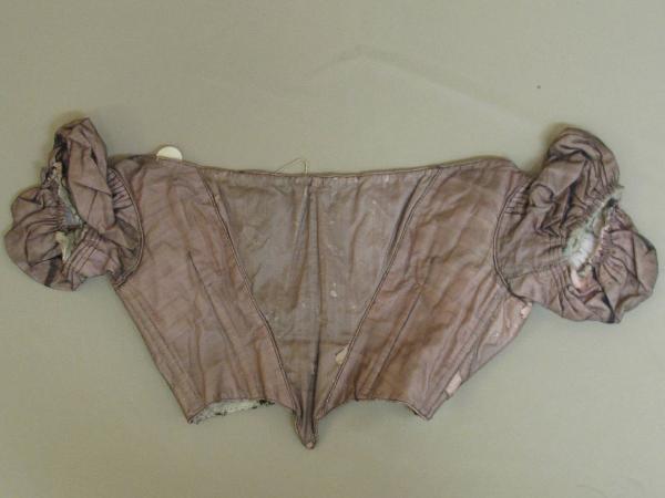 Corpino aderente, con stecche, in tulle nero doppiato con taffetas rosa, corto alla vita. Scollo a barca molto ampio regolabile con coulisse, spalle calate, corte maniche con fitte piegoline all'attaccatura e palloncino fermato a formare fiocco con finto passante cucito (la parte finale delle maniche è priva di rifiniture). Davanti in 3 pezzi, con punta centrale che scende oltre la vita. \nDorso in 2 pezzi, con fianchette; apertura centrale chiusa da ganci ; due stecche ai lati dell'apertura. Nervature nelle cuciture.\nFodera in tela bianca, alta fettuccia cucita intorno al punto vita. All'interno imbottitura nella parte anteriore dei giromaniche.
