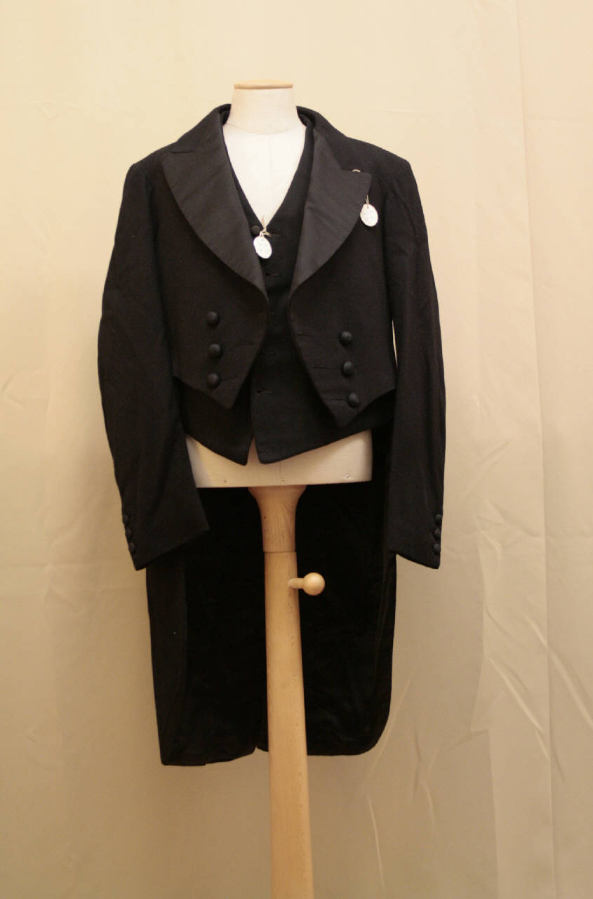 completo frac formato da giacca e gilè in diagonale nera. Giacca con taglio in vita; collo con risvolti a lancia in cannellato nero; 3 coppie di bottoni decorativi disposti a doppio petto; 3 coppie di occhielli. Falde posteriori "a coda di rondine" con spacco centrale sovrapposto affiancato da 2 pieghe, decorate da bottone in alto. Maniche con spacco al fondo fermato da 3 bottoni decorativi. Fodera in raso nero.\nGilè monopetto, corto alla vita, scollo a V, apertura con 5 bottoni. 2 taschini e 2 tasche con patta cucita. Dorso in raso nero regolabile con coppia di cinturini con fibbia, fodera in raso nero.