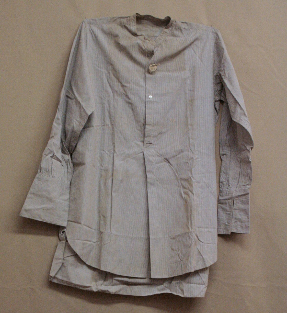 Camicia lunga in tela bianca con minuta quadrettatura blu e marrone. Collo a cinturino con due occhielli; apertura centrale anteriore fino al punto vita, chiusa da bottoni in madreperla, e cinturino interno per fissarla in vita. Sul dietro sprone diritto che sostiene arricciatura; il dietro è più lungo del davanti. Maniche lunghe con alto polsino da risvoltare e chiudere con gemelli.\nSul davanti a sinistra, all'altezza del torace, sono ricamate le iniziali "A.L".