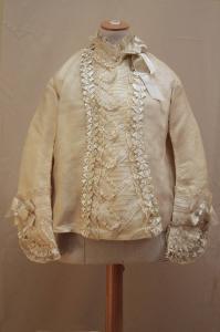 vestaglia matinée in organza avorio, doppiata in raso duchesse avorio (ordito in seta, trama in cotone). Linea svasata, collo a cinturino con ruche di organza pieghettata; apertura centrale con bottoni e ganci nascosta da larga mostra decorata da segmenti di nastri di tela bianca ricamata, profilati di merletto, posti a lisca di pesce. La mostra è profilata da nastro di raso perla pieghettato a formare piccole coccarde. maniche lunghe, sagomate, decorate al fondo come la mostra.
