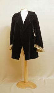 Giacca lunga al ginocchio, in velluto tagliato unito nero. Ampio collo a risvolti, apertura sovrammessa senza sistema di chiusura. Davanti lievemente svasato, dietro in 5 pezzi con taglio in vita segnata da martingala; 4 pieghe dalla vita all'orlo. Maniche lunghe, arricciate in alto, svasate, arricchite al fondo da alto engageant pieghettato in organza avorio cucito all'interno. Fodera in raso avorio; all'interno delle falde due tasche con apertura semicircolare rifinita da ruche a fitte pieghe a canna d'organo cucite.