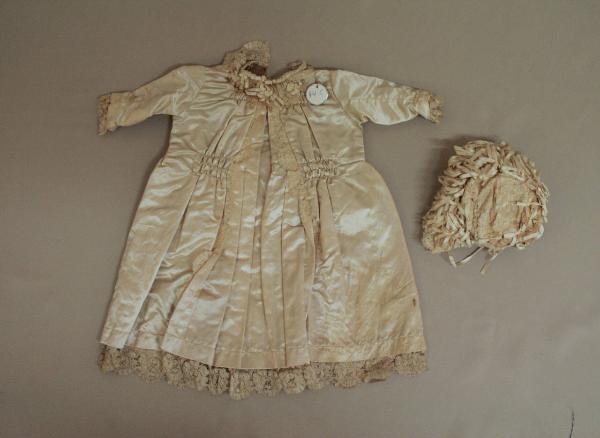 completo costituito da portinfante, abitino e cuffia, in raso duchesse (ordito in seta, trama in cotone) avorio, con applicazioni dello stesso colore in merletto, nastrino di raso, nastro marezzato. Cuscino portinfante imbottito di crine, con rivestimento trapuntato, bordi profilati da ruche di merletto e nastrino e fiocchi decorativi. Fodera in diagonale nocciola.\nAbitino a maniche lunghe, in un solo pezzo; sul davanti pieghe centrali e arricciature al punto vita. Dietro con lungo sprone foderato in diagonale nocciola, e apertura centrale con coppie di laccetti. Ruches di merletto al collo, polsi e orlo. Cuffia ricoperta dal merletto, con decorazione a fittissimi fiocchi in nastrino di raso cuciti lungo il profilo anteriore con effetto di frangia.