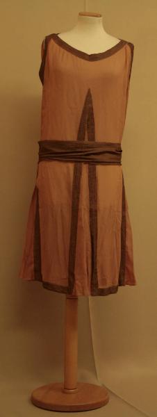 Abito corto a tunica di linea svasata senza maniche, in crespo color rosa cipolla. Scollo a barca. Davanti e dietro costituiti da un unico telo, sul davanti al centro e sui fianchi sono inseriti lunghi gheroni in sbiego. Bordo scollo, giromaniche e inserimento dei gheroni profilati da un bordo nello stesso tessuto ricamato fittamente a macchina a punto catenella in filo dorato.\nTenuto a piombo da pesi inseriti nell'orlo. Corredato da fusciacca in crespo ricamato in oro, con fibbia metallica attualmente separata, da posizionare sui fianchi segnando la vita bassa dell'abito.\nConfezione sartoriale.