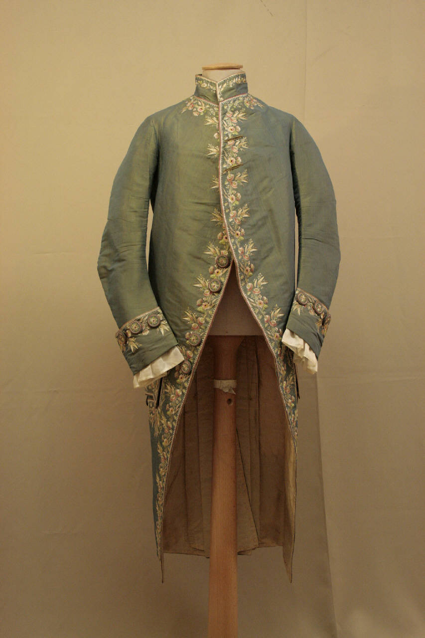 Completo: marsina e calzoni in taffetas cangiante azzurro-giallo, ricamato a punto pieno, lanciato, erba e nodi in seta in avorio, verde chiaro, rosa, con rose, myosotis fiori con foglie sagittate. \nMarsina: collo a cinturino (h 5cm), mostre appena stondate con 10 bottoni rivestiti (di cui 2 mancanti) e 2 occhielli sul torace. Falde sfuggenti verso il dietro. Tasche sotto i fianchi con patta sagomata e 3 bottoni decorativi sotto la patta. Maniche lunghe, aderenti, sagomate, alto paramani con 3 bottoni decorativi. Dorso che scende sotto il punto vita; spacchi laterali cuciti entro doppia piega con bottoni in alto; spacco centrale. Fodera in diagonale avorio. \nCalzoni: alta cintura chiusa davanti con 3 bottoni rivestiti; dietro l'apertura è stata cucita e spostati i cinturini; 2 taschini con patta cucita. Bottoni per bretelle (alcuni perduti). Patta alla marinara chiusa da 3 occhielli; 2 tasche sotto la patta e 2 inserite sui fianchi. Spacco al fondo con 4 bottoni. Doppiati in tela bianca cintura, patta e cinturini.\nGilè: in gros avorio, ricamato con diverso disegno ma stessi colori. Girocollo, mostre diritte con 12 bottoni e occhielli corrispondenti; falde a punta, tasche e patte sagomate. Dorso e fodera in tela bianca; nelle mostre in taffetas avorio. Allargato sui fianchi.