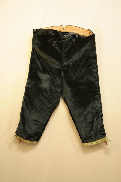confezionati in velluto tagliato di lana verde bottiglia; cinturini in gallone oro, verde e giallo con stemma Corti.\nAlta cintura chiusa davanti con 3 bottoni in metallo; sul dietro baschina a punta con cinturino regolabile. Bottoni per bretelle davanti e dietro.\nPatta alla marinara larga fino ai fianchi fermata a 4 bottoni. Sotto la patta due tasche oblique. Gambe aderenti, con spacco al fondo chiuso da 3 bottoni e da cinturino con fibbia. \nFodera nella cintura in tela cerata nera; tasche in tela nocciola.