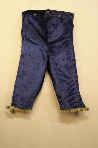 confezionati in velluto tagliato di lana blu scuro; cinturini in gallone oro, verde e giallo con stemma Corti.\nAlta cintura chiusa davanti con 3 bottoni in metallo.\nPatta alla marinara larga fino ai fianchi fermata a 4 bottoni. Sotto la patta due tasche oblique. Gambe aderenti, con spacco al fondo chiuso da 3 bottoni e da cinturino con fibbia. \nFodera nella cintura in tela cerata nera; tasche in tela nocciola.