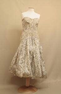 Completo composto da abito a palloncino corto e giacca bolero, in taffetas avorio stampato a macchioline a goccia nere. Abito con corpino aderente con stecche, doppiato in tulle; scollo totale a cuore. Apertura sul fianco sinistro con cerniera e nastro stringivita. Gonna a palloncino, in due teli. Rimborso resa da sottogonna in taffetas avorio, più corta, alla quale è fissato l'orlo della gonna. Il tessuto del corpino e della parte alta della gonna è fittamente pieghettato mediante filze ancorate alla doppiatura in tulle. Bolero nello stesso tessuto, foderato in taffetas avorio; sul davanti, sagomato da pinces, l'apertura sormonta leggermente ed è fermata da un automatico e un gancio. Maniche lunghe a chimono.\nEtichetta in nastro operato all'interno dell'abito.