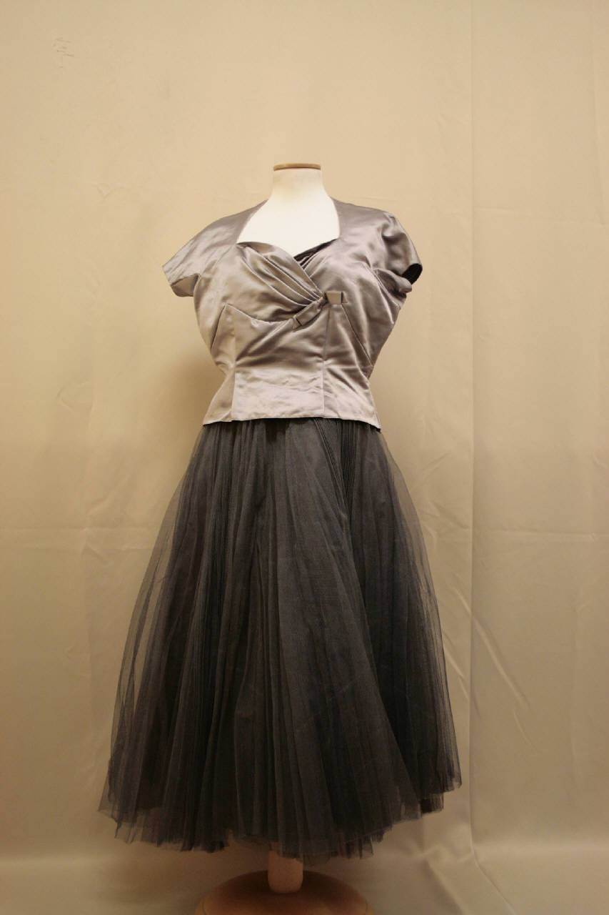completo formato da corpino in raso grigio argento e gonna a crinolina in tulle plissettato. Corpino aderente, lungo poco oltre la vita, con scollo a trapezio e corte maniche a chimono con tassello. Sul seno drappeggio incrociato con fiocco decorativo; Cerniera sul fianco sinistro e nastro stringivita. Gonna al polpaccio con cinturino e cerniera sul fianco sinistro. Formata da più strati di tulle con sottogonna grigio argento.