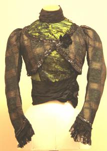 corpino aderente con stecche, in garza di seta nera operata lanciata con effetto di ampi riquadri neri a minuti decori, con bordi in rosa e verde. Collo a guimpe in raso nero chiuso dietro con 2 piccole ruches. Il davanti simula un bolero con ampio scollo ovale, mostre sagomate sovrapposte su pettorina con modesto rimborso in tulle nero ricamato con paillettes e perline a contrasto su taffetas cangiante verde/nero. La pettorina ha apertura a sinistra ed è fermata in basso da un'alta cintura a fascia drappeggiata in raso nero. La cintura definisce il punto vita più in alto e a punta sul dietro. Maniche a prosciutto, lunghe, leggermente svasate al fondo, profilato con doppia ruches in merletto nero. Il finto bolero e le maniche sono rifiniti da nastro di tulle nero ricamato con perline e paillettes nere. Ilcorpino è doppiato con diagonale verde che forma, sul davanti, busto separato, steccato chiuso anteriormente da ganci. All'interno nastro stringivita con ganci.