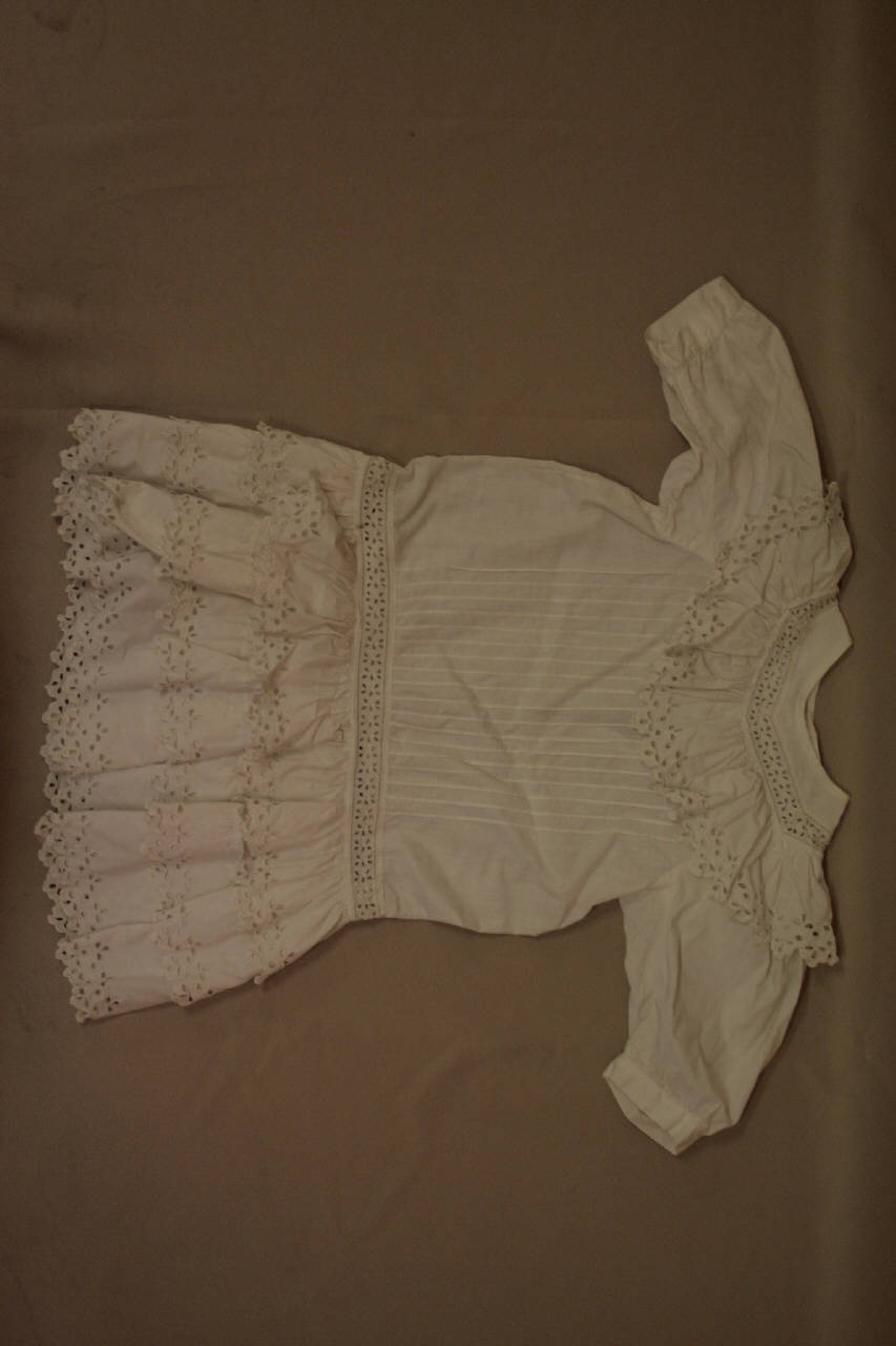 abito in leggera tela bianca, con ricamo meccanico in bianco (broderie anglaise). Girocollo, con nastro entredeux e gala arricciata parallela al bordo scollo; corpino a vita bassa segnato da piccole pieghe verticali; gonna a tre gale arricciate fermata al corpino da nastro entredeux. Maniche lunghe, leggermente arricciate e strette al fondo da polsino. Apertura posteriore centrale con bottoni in madreperla.
