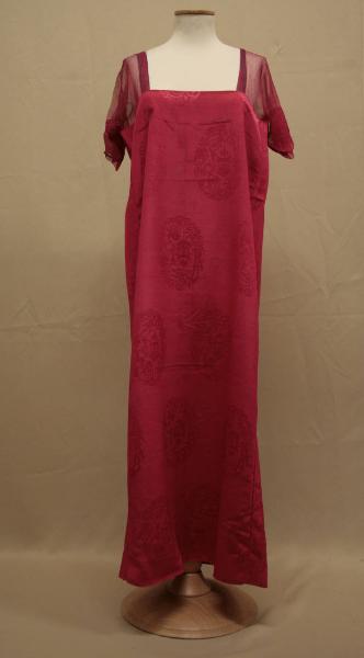 abito a tunica, lungo alla caviglia, in damasco di Tour color lampone, con scenette circolari di motivi cinesi, poste a scacchiera. Scollo rettangolare ampio sul davanti e sul dietro; maniche corte a chimono in crespo dello stesso colore. Nelle maniche, all'interno del bordo verso è cucito a rinforzo nastro nero. L'interno dell'orlo dell'abito è rinforzato con un'alta banda di crespo cucita. Etichetta in nastro operato cucita all'interno, dietro lo scollo.