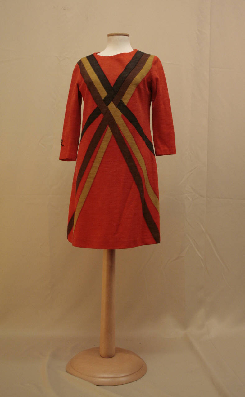abito corto in jersey stampato: su fondo arancio tre nastri nero, senape e marrone, partono da ciascuna spalla, si intrecciano sul seno e si divaricano verso i fianchi formando una grande X. Linea appena svasata, girocollo, maniche lunghe aderenti. Sulla manica destra, al fondo, grande R in nero. \nEtichetta in nastro operato all'interno.