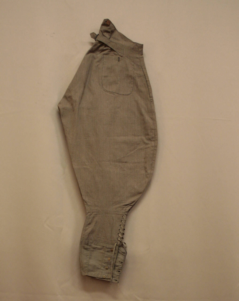 calzoni alla zuava in spina color nocciola. Alti in vita, senza cintura, con bottoni predisposti per bretelle; patta verticale con 6 bottoni con marchio. 2 tasche inserite sui fianchi, 2 applicate sul dietro. Cinturino regolabile sul dietro. Molto ampi sulle anche, ristretti sotto il ginocchio con fascia in raso color tortora. Spacco chiuso da lacci passanti e da bottoni. All'interno, al centro dietro, etichetta in nastro stampato con marchio, data e indicazione del proprietario.