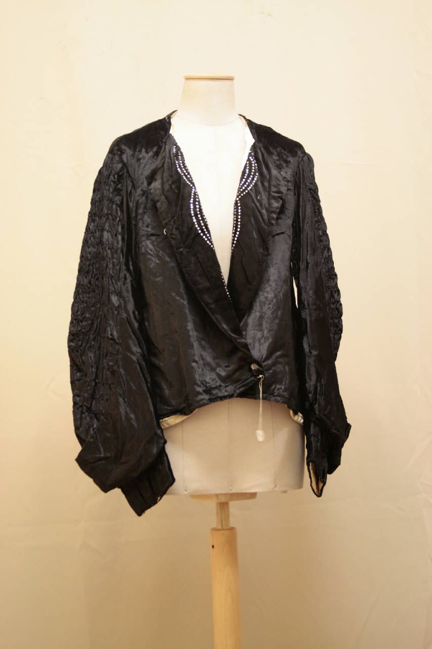 giacca lunga ai fianchi, di linea vasata, in velluto nero decorato con strass. Profondissimo scollo a V chiuso da un bottone all'orlo; collo con risvolti decorati da strass; perduta la rifinitura del girocollo. Dietro con ampio decoro di strass e motivi a volute presso l'orlo eseguiti atrapunto. maniche lunghe, sagomate, con effetto di doppia manica; interna a fitte arricciature ed esterna formata solo da alto polso e parte bassa. Fodera in raso avorio, imbottitura interna.