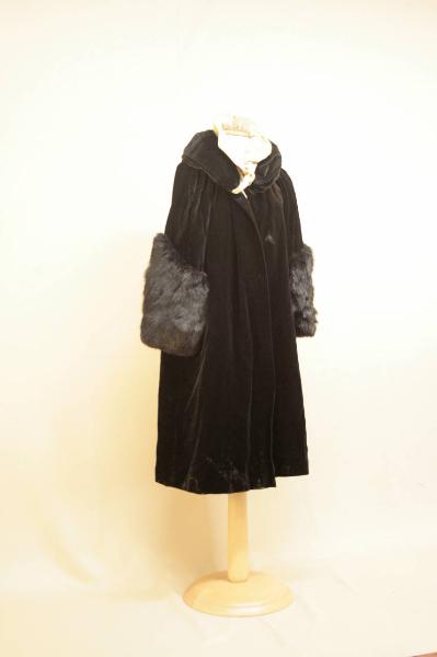 soprabito lungo al polpaccio, di linea diritta, in velluto nero doppiato in velluto avorio. Girocollo con triplice collo a gale doppie e arricciate, 2 nere e una avorio. Apertura anteriore senza sistema di chiusura. Maniche lunghe, a chimono, con taglio raglan suldavanti, con alto paramani in pelliccia nera.