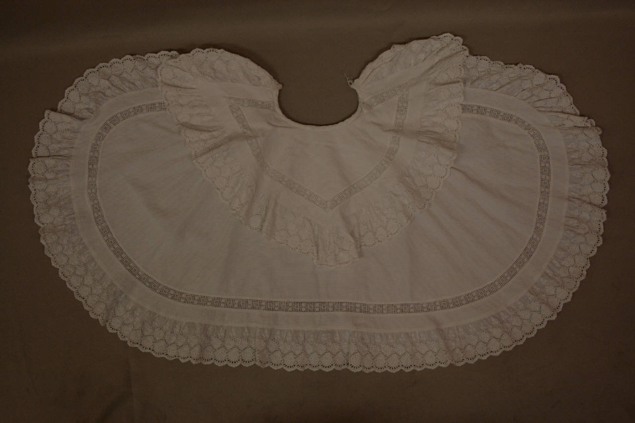 mantellina da bambina in piquet millerighe bianco, di forma ovale, con largo collo a punte. Mantellina e collo profilati da gala in merletto a ricamo meccanico tipo San Gallo, parallela alla gala una falsatura a broderie anglaise. Bottone in madreperla allo scollo.