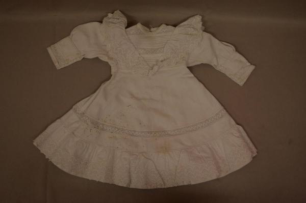 Abito in tessuto operato tipo piquet bianco,con motivo a rombetti, garzato Sprone con tramezzi in merletto meccanico a ricami tipo San Gallo; girocollo, alette arricciate, maniche lungo arricciate con alto polsino chiuso da 3 bottoni. Apertura posteriore con bottoni di madreperla. Gonna svasata, con tramezzo e gala all'orlo.