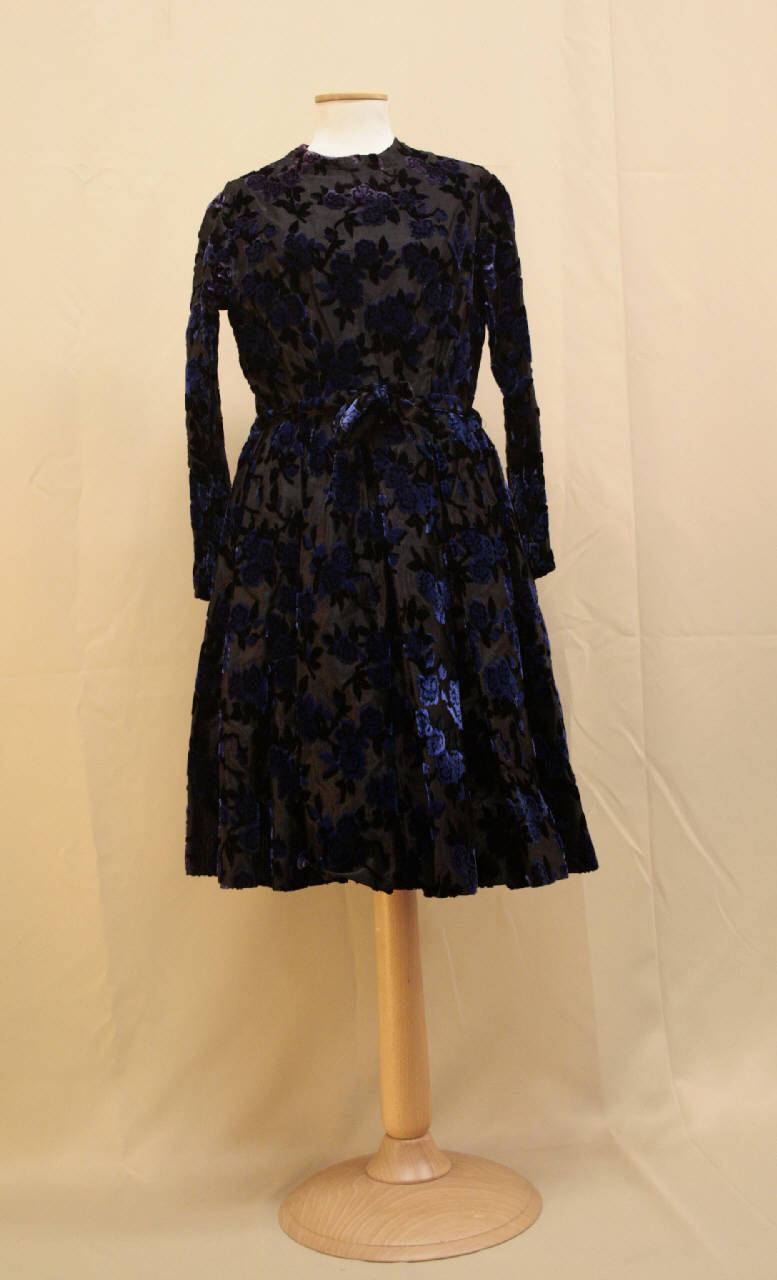 abito corto sotto il ginocchio in velluto tagliato operato, a fondo nero con rami fioriti blu elettrico, viola e nero. Corpino aderente, modellato da pinces, girocollo. Maniche lunghe aderenti. Apertura posteriore con cerniera e nastri stringivita. Gonna a cupola, con cannoni semplici per tutta la circonferenza.