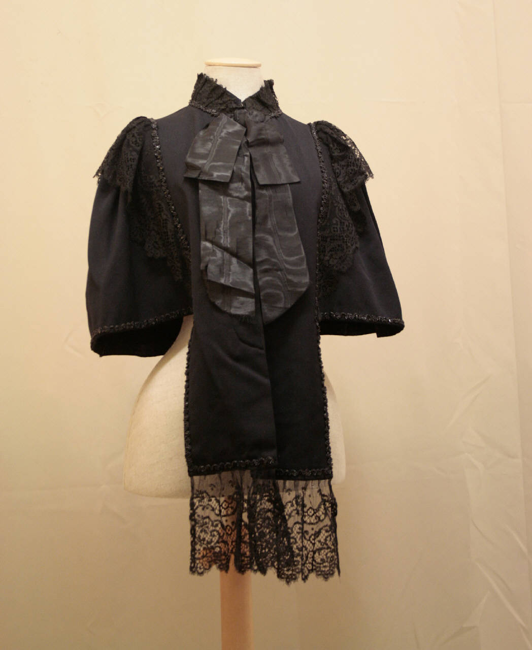 Mantello visite in diagonale nera, corto alla vita, con parte anteriore che scende fino ai fianchi orlata da balza in merletto nero. Collo a cinturino ricoperto in merletto nero e profilato da passamaneria tessuta con perline di jais. Apertura anteriore centrale con abbottonatura nascosta e fiocco in nastro marezzato alla basa del collo. Alette in merletto nero decorate dalla passamaneria di perline, che segna la cucitura della parte che copre le braccia. Piccola coda posteriore decorata da merletto nero e 4 nappe in perline. All'interno nastro stringivita.