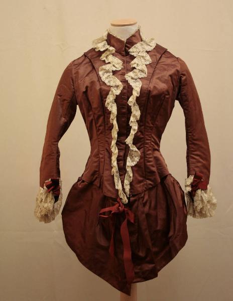 Giacca aderente, con stecche, lunga ai fianchi, in raso color tabacco. Davanti in due pezzi modellati da pinces, con mostre accostate e risvoltate su pettorina nello stesso tessuto con collo a cinturino e apertura centrale con 8 bottoni e occhielli dal collo a sotto il seno, ganci nascosti fino all'orlo. Ai risvolti sono applicate ruches di merletto avorio. L'orlo è sagomato con punta centrale; dall'interno scendono 2 lembi stondati, drappeggiati sui fianchi. Dietro in 6 pezzi; i due centrali ripiegati su se stessi all'orlo formano piccola coda. I 2 laterali si estendono in falde drappeggiate e riunite sui fianchi ai lembi provenienti dal davanti formando un falso grembiule. Maniche lunghe, aderenti, sagomate, profilate al fondo da ruches in merletto. Fiocchi in nastro color ruggine ai polsi e all'orlo della giacca, davanti e sui fianchi. Dietro doppiato in tela bianca, sul davanti busto staccato che sostiene la pettorina e i lembi drappeggiati anteriori. F ettuccia stringivita.