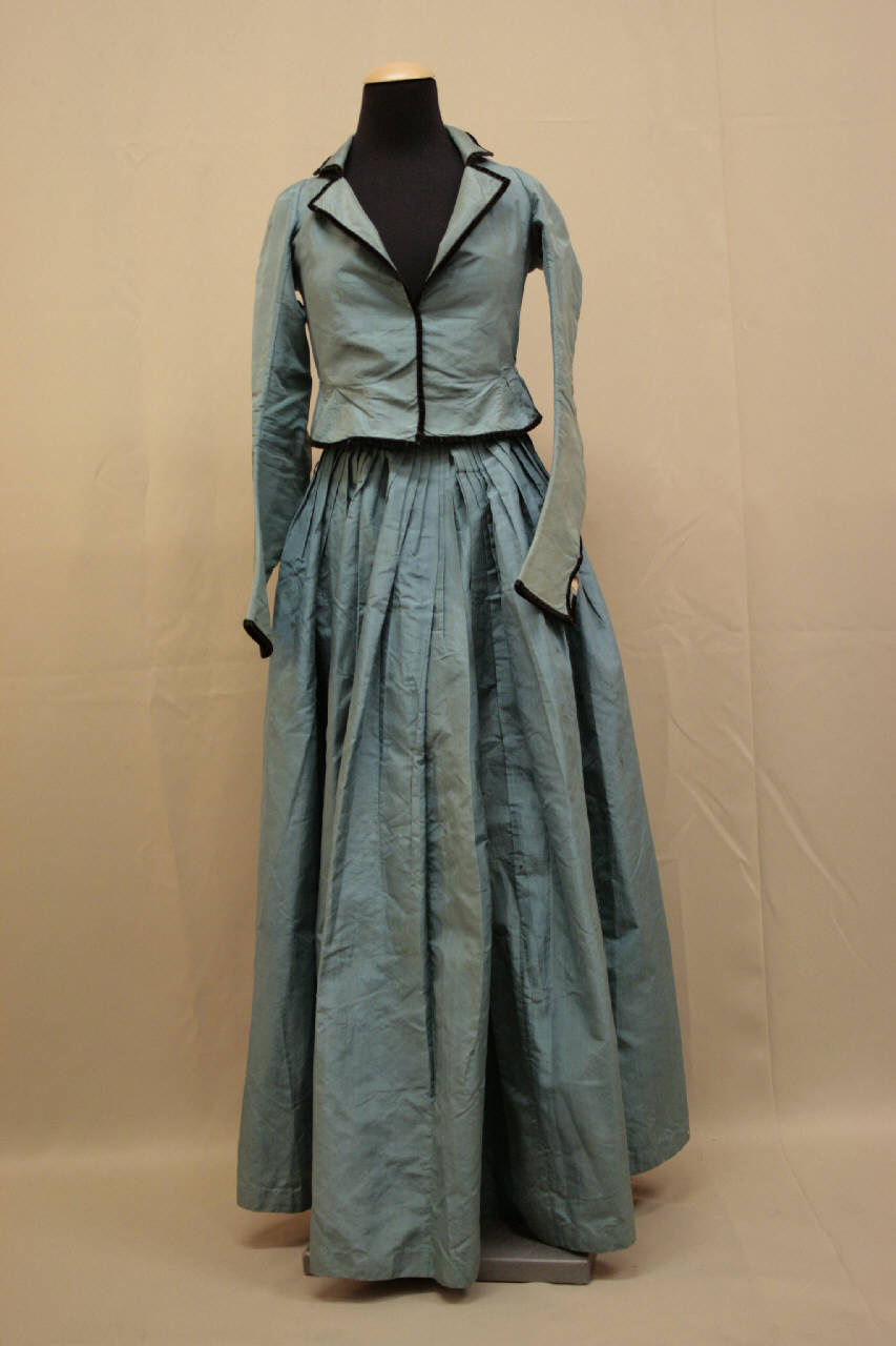 Completo femminile composto da giacca e gonna, in taffetas azzurro con profilature in nastri di velluto nero.\nGiacca aderente, aperta davanti senza allacciatura; scollo a V e collo a due piccoli risvolti. Maniche a pala alta arricciata, lunghe a coprire il dorso della mano, aderenti e leggermente svasate al fondo con spacco e bottoncino in velluto. Dorso trapezoidale molto stretto, linea delle spalle molto arretrata.\nLungo il punto vita, da fianco a fianco, è realizzata una pence orizzontale che accorcia e sagoma la giacca creando un effetto di baschina, accentuato dall'inserimento di 4 piccoli gheroni (interventi di modifica successivi).\nBusto e maniche foderate in tela naturale; sul davanti la fodera costituisce un busto autonomo, scollato sotto il seno, chiuso al centro davanti da lacci passanti in occhielli; due stecche inserite ai lati dell'allacciatura.\nGonna a cupola a 4 teli e gheroni, arricciata da coulisse sul davanti e sul dietro da fitte pieghe convergenti al centro. Punto vita profilato da nastro in seta azzurra.