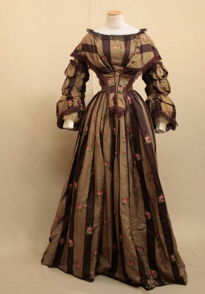 Completo composto da corpino e gonna lunga a crinolina, in taffetas di seta shantung stampato ad effetto pekin, a rigature nocciola e marrone, con roselline rosa a scacchiera. Corpino aderente con stecche, a punta sul davanti e sul dietro, dove è chiuso da ganci e nastro stringivita all'interno. Scollo a barca profilato da merletto nero; sulle spalle il tessuto è fittamente arricciato, sciolto all'altezza del seno e ristretto al centro del punto vita da pieghe cucite. Dietro in 4 pezzi. Attorno allo scollo è cucita una mantellina a scialle con frangia in seta marrone, le cui punte anteriori scendono oltre la vita. Maniche lunghe, svasate al fondo e guarnite con frange; all'altezza del gomito due sbuffi creati da due coulisse (sottomaniche replica). Gonna a crinolina a 5 teli, ristretta in vita da pieghe convergenti al centro davanti e da fitta pieghettatura sul dietro. Doppiata in tela di cotone rada; tasche a sacchetto inserite nella cucitura del telo centrale anteriore.