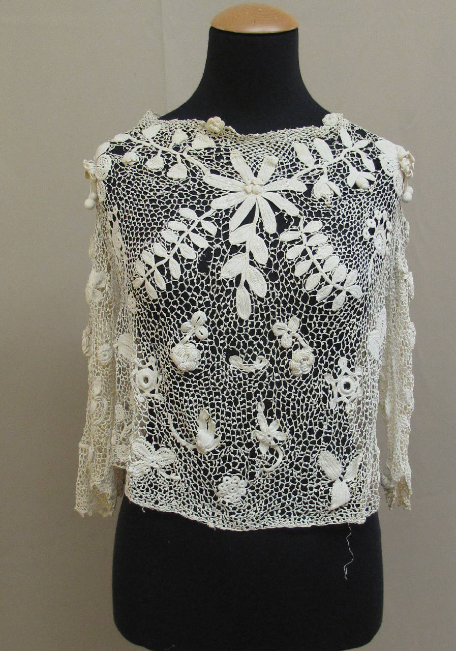 camicetta lunga poco oltre la vita, in merletto bianco all'uncinetto a punto Irlanda, con grande fiore a stella davanti alla base dello scollo e 4 tralci con foglie che si dipartono a X. Busto in un unico pezzo, con piccolo scollo rotondo e apertura posteriore chiusa da automatici. Maniche a 3/4, unite al busto con cucitura al giromaniche. Probabilmente in origine era dotata di fodera (tracce di cuciture).