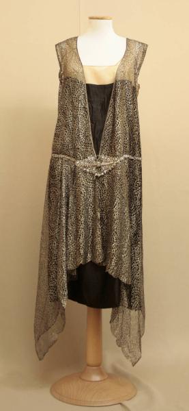 Abito corto a tunica senza maniche, in merletto meccanico nero e argento con sottabito in raso nero con sprone in crespo leggerissimo color cipria.\nConfezionato con due teli romboidali di merletto disposti con la diagonale sui fianchi così da creare orlo con due punte asimmetriche laterali.\nDavanti profondissimo scollo a V che scende oltre la vita, velato dal sottabito. Alla base dello scollo, sul bacino, è applicata una decorazione argento a losanga in strass, perline e due anelli in vetro.\nDall'applicazione partono due finti cinturini in strass e perline che girano sui fianchi fino al centro dietro.\nDalle spalle scendono sul dietro due lunghe bande di pizzo che formano una V terminante al punto di unione dei due teli romboidali con grossa nappa in canutiglia e perline.\nConfezionato con cuciture a mano.\nAll'interno, al centro davanti, etichetta in nastro operato con marchio.