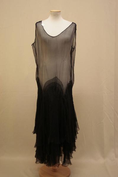 Abito a vita bassa, senza maniche, lungo alla caviglia, in crespo nero. Corpino diritto, scollo ampio rotondo; all'altezza della vita, davanti e dietro, due gruppi di tre nervature modellano leggermente l'abito. La linea di attacco della gonna è a 5 ampie centinature: le punte verso il basso sono tenute a piombo da pesini circolari. La gonna è costituita da due balze e da 5 grandi petali inseriti negli archi della centinatura: le balze sono a lunghezza decrescente e hanno orlo a grandi smerli. L'abito è trasparente e privo di sottabito.