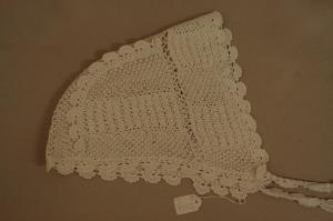 Cuffia bianca, lavorta ad uncinetto a vari punti che formano campiture. Confezionata in più pezzi uniti nella lavorazione. Ruches e lacci di merletto all'uncinetto.