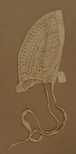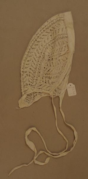 Cuffia bianca lavorata a ferri in un unico pezzo, con motivo di foglie disposte a V. Profilata con fettuccia di tela bianca da annodare sotto il mento.