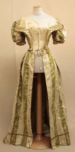 Abito intero lungo, aperto davanti, in pekin rigato verde e avorio (raso, cannetillé) con decoro a sottili rami con foglie e fiori. Corpino anteriore doppio: interno in raso avorio con scollo ovale ( modificato grossolanamente da girocollo originale), con stecche, modellato con pinces; apertura centrale con ganci. Corpino esterno che simula corta giacchina con ampi risvolti avorio decorati con ricamo con cordoncino dorato applicato. Maniche corte a palloncino. Fodera in diagonale avorio. Al corpino interno sono cuciti i teli anteriori della gonna, aperti su sottanino o sottogonna perduti; all'interno del corpino ganci per fermare la gonna. Dietro a teli interi dallo scollo all'orlo, con ampie pieghe sotto il punto vita e breve strascico. All'interno è fissato con spilli un cartellino manoscritto con note della proprietaria (vd foto).
