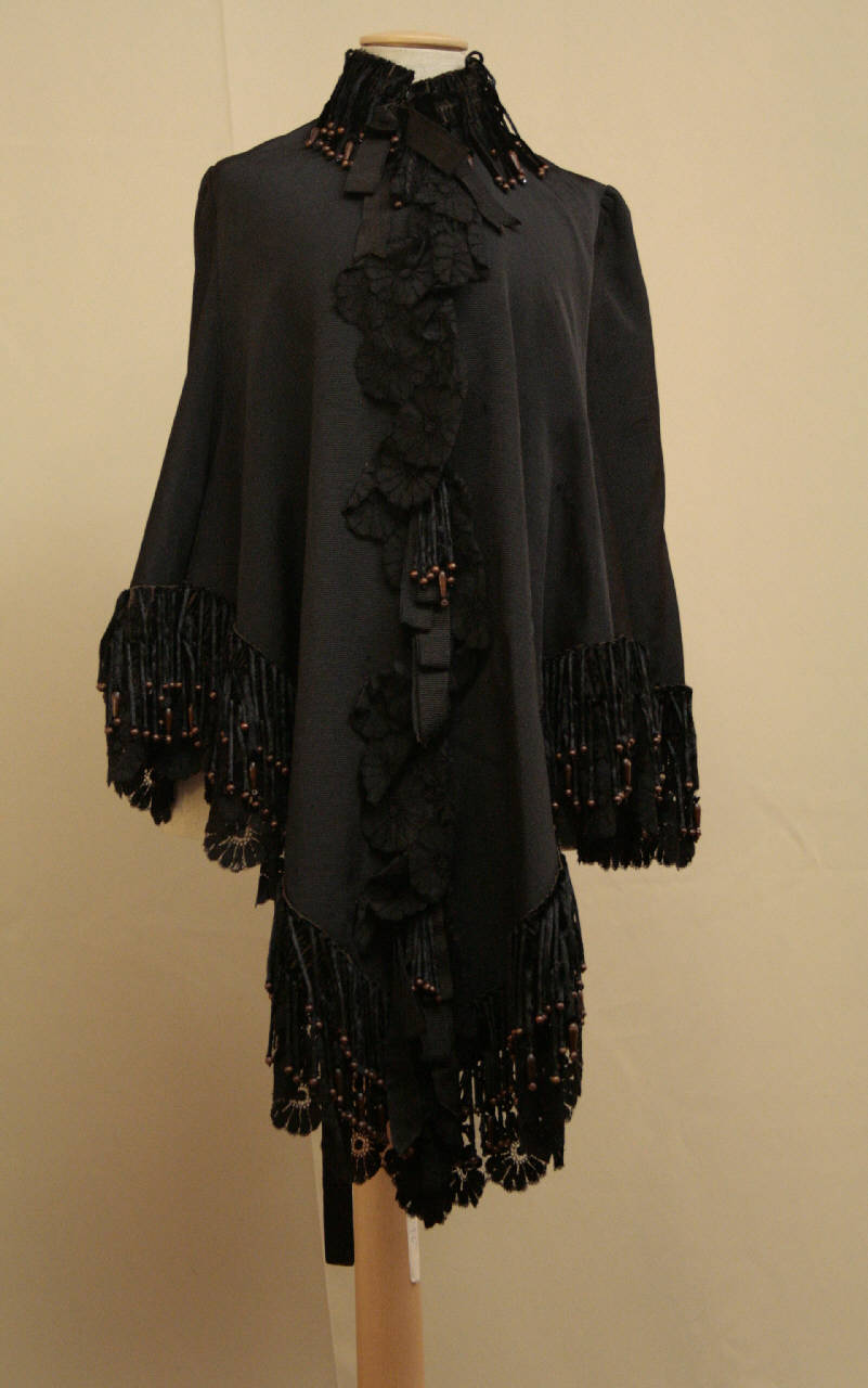 Mantello visite in cannellato (a coste alternate 3/1) nero, profilato all'apertura e all'orlo da merletto nero e da frangia in ciniglia con perle e gocce in legno. Collo a cinturino chiuso da 2 ganci, apertura con abbottonatura nascosta con 9 bottoni rivestiti in raso nero. Lungo l'apertura sono applicati 3 fiocchi in nastro e nappe di ciniglia. Maniche lunghe a pipistrello. Dorso in 2 pezzi, vita aderente (nastro interno stringivita) e falda decorata da fiocchi e nappe.