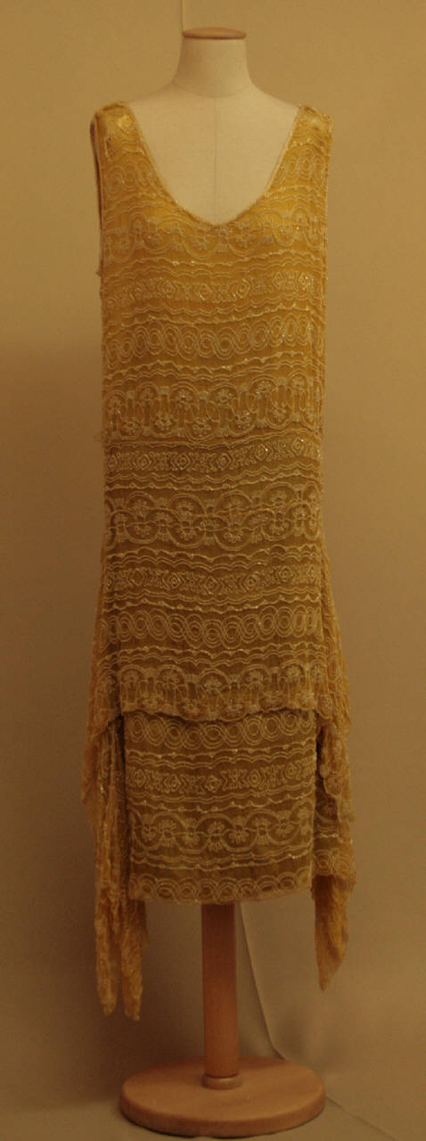 Completo formato da tunica e gonna, lungo al polpaccio, senza maniche, in crespo giallo brillante, completamente ricamato con perline e cannette in vetro bianco (ricamo meccanico Lunéville) con decoro a bande orizzontali di piccoli motivi floreali e geometrici.\nTunica lunga sotto i fianchi, con ampio scollo rotondo davanti e a V dietro. In basso è applicata una banda, più larga della tunica, nello stesso tessuto e ricamo, che dà al modello una forma di T capovolta.\nGonna diritta, lunga sotto il polpaccio, di cui non è ben leggibile la struttura a causa di evidenti alterazioni, è confezionata con tessuto laminato dorato, e priva di sistema di fermatura in vita dove sono presenti ampi lembi di taffetas giallo e rosa. Al fondo è applicata una banda, più larga della gonna, nello stesso crespo giallo ricamato, che dà al modello una forma di T capovolta analoga alla tunica.